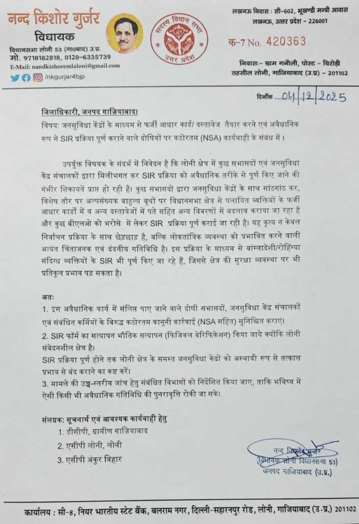 गाजियाबाद: लोनी क्षेत्र में चल रहे विशेष गहन पुनरीक्षण (SIR) अभियान में गंभीर अनियमितताओं का आरोप सामने आया है। इसके बाद लोनी से भाजपा विधायक नंदकिशोर गुर्जर ने जिलाधिकारी को पत्र लिखकर इस मामले में कड़ी कार्रवाई की मांग की है।