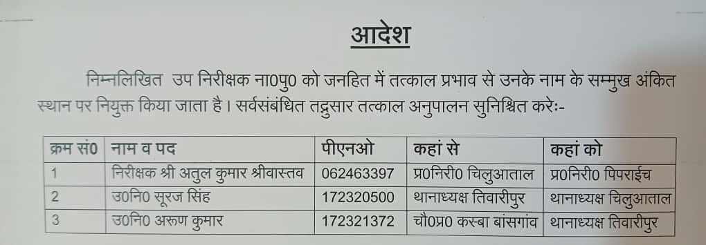 जारी सूची के अनुसार, चिलुआताल थाना प्रभारी अतुल कुमार श्रीवास्तव को पिपराइच का नया थानाध्यक्ष बनाया गया है।